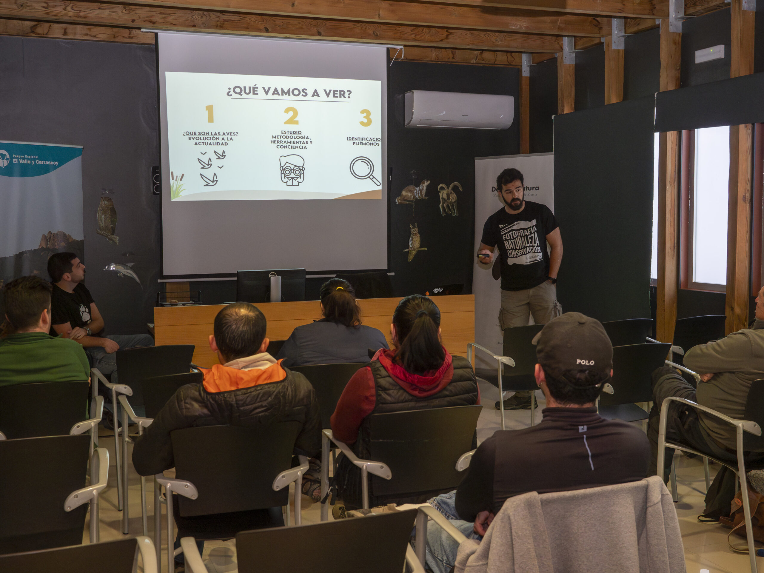 La jornada comenzó con la acogida de l@s participantes en el aula de naturaleza del Centro de Recuperación de Fauna Silvestre El Valle, donde tuvimos la oportunidad de disfrutar de la charla con los contenidos básicos. Mientras Pablo y Mario nos enseñaban la mejor manera de aficionarse a la observación, destacó la calidez de un grupo participativo y entusiasta, generando un ambiente que se caracterizaba por una interacción constante entre asistentes y ponentes.